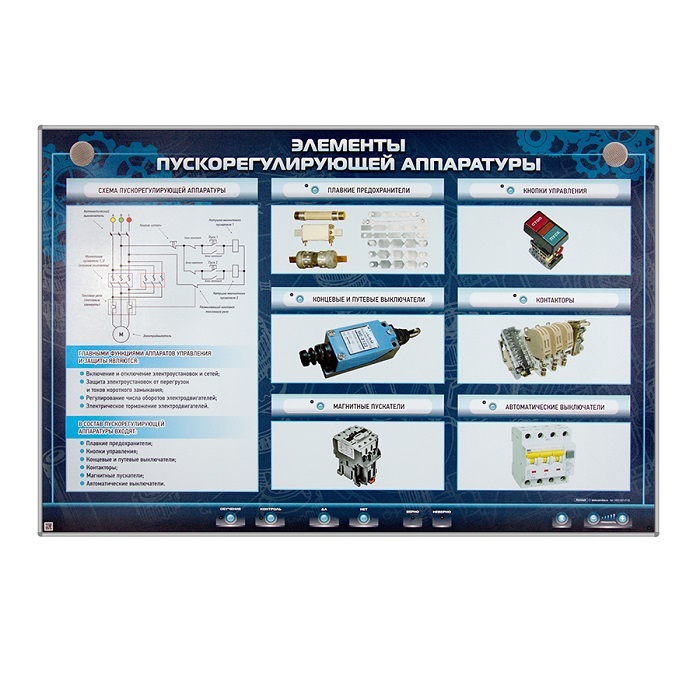 Электрифицированный стенд "Элементы пускорегулирующей аппаратуры" представляет собой полноцветную светодинамическую панель, на которой отображена информация о назначении и выполняемых функциях. Представлены схемы включения, принцип работы, классификация пускорегулирующей аппаратуры.