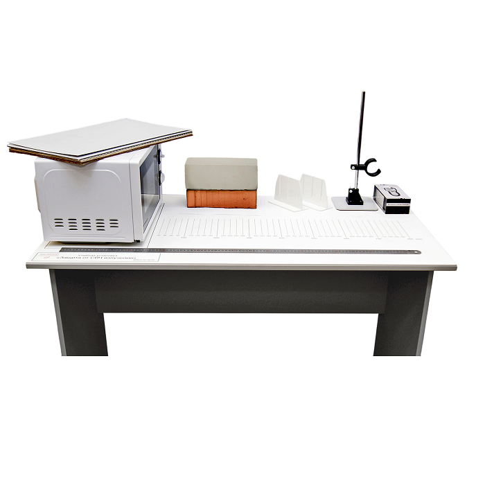 Учебная установка состоит из лабораторного стола с нанесенной координатной разметкой, устройством крепления экранов, бытовой СВЧ печи с устройством имитации утечки излучения, комплектом экранов, комплектом балластных поглотителей СВЧ поля, а также устройства измерения плотности потока мощности утечки СВЧ излучения с цифровой индикацией показаний (датчик СВЧ излучения).