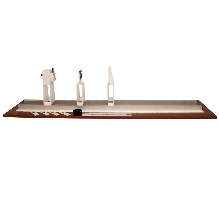 Комплект состоит из установка источника белого света с регулируемым источником питания, сетки, собирательной линзы и экрана с миллиметровой шкалой в виде креста, устанавливаемых в рейтерах на оптической скамье. На боковой поверхности скамьи нанесена миллиметровая шкала. В комплект входит набор, позволяющий изучать
