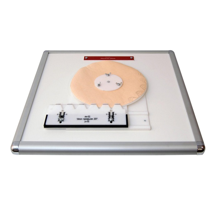 Состоит из основания, выполненного из алюминиевого профиля и панели и АБС пластика. На нем установлен диск для установки бумажных образцов (d образца 270 мм). В комплекте поставляются 2 модели червячной фрезы, предназначенные для разных чисел зубьев.