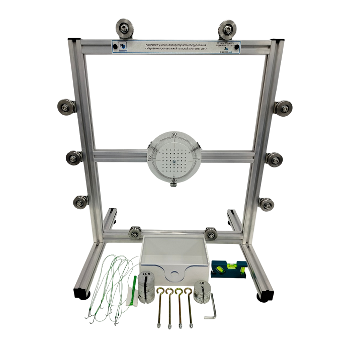Комплект учебно-лабораторного оборудования «Изучение произвольной плоской системы сил» предназначен для проведения экспериментов по подтверждению теоремы Пуансо с использованием методов уравновешивания тела, выведенного из состояния равновесия путем приложения произвольной плоской системы сил.