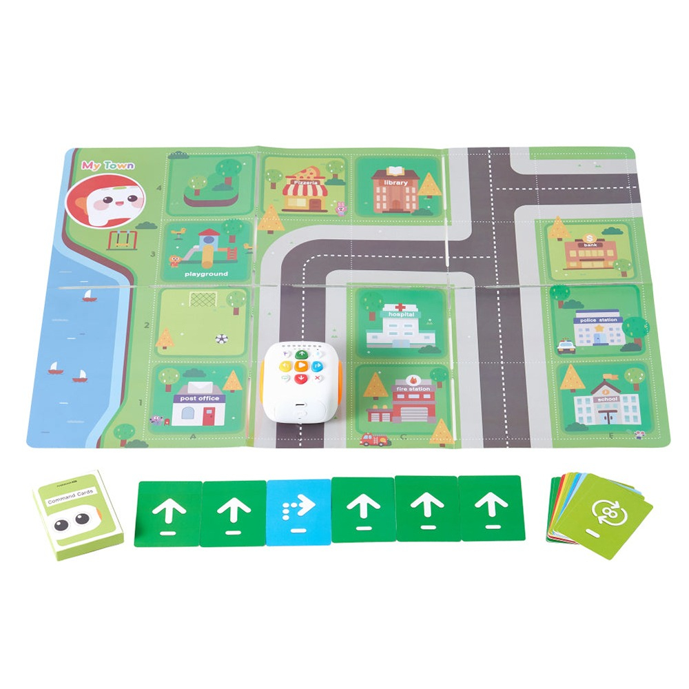 Поля для передвижения робота с встроенными «метками» голосовых сообщений, робот программируется кнопками «вперед-назад-влево-вправо» на корпусе робота. Подъезжая к определенной клетке со встроенным головным сообщением, робот произносит предустановленный озвученный текст, давая инструкции или команды для программирования робота. В комплекте 5 двусторонних тематических полей с заданиями и одно пустое поле для наклеивания интерактивных наклеек