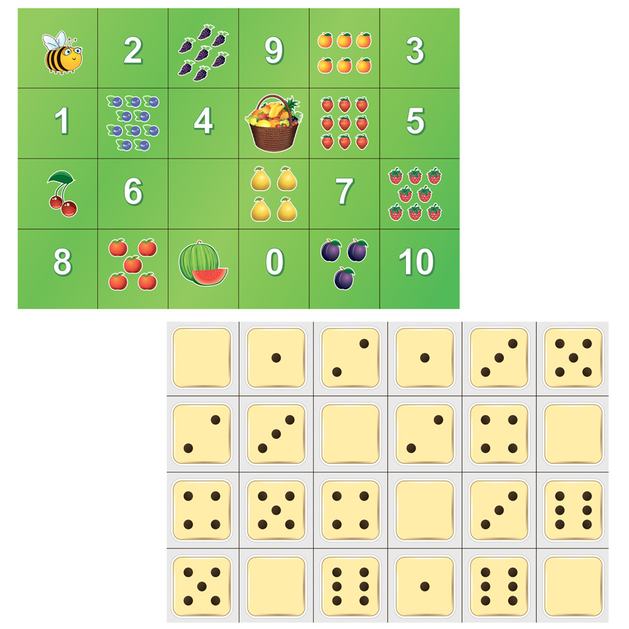 На каждой из сторон поле имеет износостойкое покрытие с нанесенными полиграфическим способом красочными рисунками: на одной стороне цифры от 0 до 9 и число 10, фрукты и ягоды в количестве, соответствующем цифрам, на другой стороне – изображение граней игральных кубиков с точками от 1 до 6, а также граней без точек.