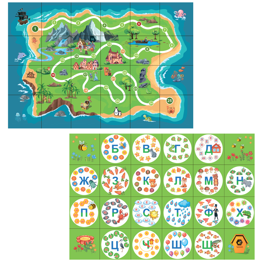 Поле разделено на квадраты, расстояние между центрами которых составляет 150 мм (шаг мини-робота Bee-Bot). На каждой из сторон поле имеет износостойкое покрытие с нанесенными полиграфическим способом красочными рисунками: на поле «Слоги» в каждом квадрате, за исключением угловых, изображены объекты живой или неживой природы, а также крупные согласные буквы русского алфавита и мелкие гласные буквы, образующие слоги с согласными буквами, на другой стороне – на поле «Остров» изображены различные представители животного мира, морских обитателей, строений, водоемов и букв русского алфавита, а также маршруты с кружками для игры в «ходилки».