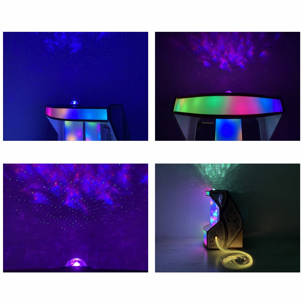 Сверху на крышке установлен проектор звёздного неба. С помощью него можно создать успокаивающую атмосферу расслабления и отключения от тревожных мыслей. Можно включить аудиосопровождение через колонку «Иллюминара» в сочетании с завораживающей проекцией звёздного неба на стены и потолок. У проектора есть 3 уровня яркости и 10 режимов переключения разных цветовых эффектов. Там же на крышке расположены кнопки управления музыкальной системой, встроенной в «Иллюминар». Музыку можно добавлять из вашего телефона, компьютера или другого устройства.