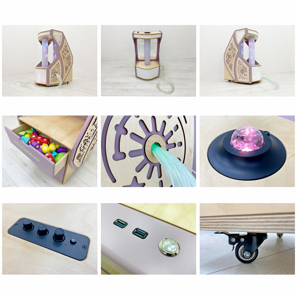 Универсальное оборудование для оснащения сенсорных комнат и кабинетов детских психологов. Мобильный комплекс включает: световую колонну, фонтан из фибероптического волокна, шестигранное «Зеркало бесконечности», сенсорные панели, нейротренажёры, проектор звёздного неба и встроенную музыкальную систему.