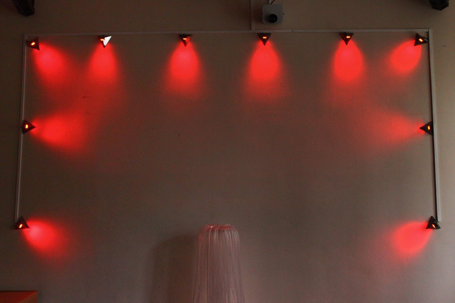 На вершине треугольника расположен зеркальный куб, дающий цвета: красный, зеленый, синий. Светильники устанавливаются на стену. Для создания и воспроизведения разнообразных световых картин используется диммерный блок и световой пульт. Управление диммерным блоком осуществляется по протоколу ДМХ512. Пульт содержит также ряд встроенных программ управления светом.