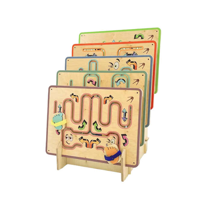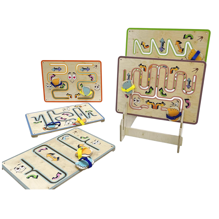 В комплекте идёт пять платформ-лабиринтов и подставка для них. Можно повесить все сразу, если позволяет помещение, можно только одну — и заменять платформы по мере надобности. В методическом пособии собраны варианты занятий, которые можно проводить с детьми.