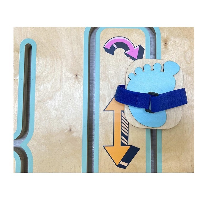 Платформа «Ногоборда» закрепляется на стене, дети садятся на пол, вставляют стопы в специальные крепления на подвижных бегунках и передвигают эти бегунки по лабиринту.