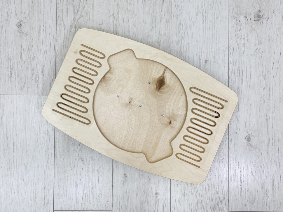 Это игровой тренажёр, улучшающий работу мозга через тренировку всего тела. Состоит из прямоугольной доски, закреплённой на неустойчивом основании в виде полусферы. В зоне ног ребристая змейка и противоскользящее покрытие. В центре балансира углубление под вставку-лабиринт. Её можно заказать отдельно.