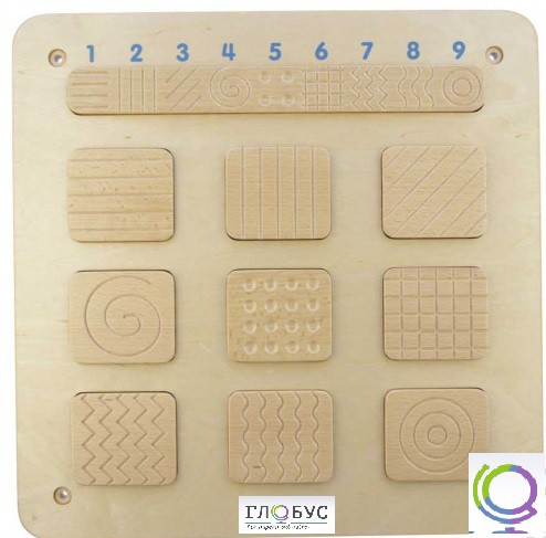 Настенная панель выполнена из березовой фанеры. На лицевой части в больших прямоугольных углублениях расположены 9 образцов деревянных плашек с различной текстурой поверхности для тренировки тактильных навыков.  В верхней части расположены схожие образцы текстурных поверхностей. Над деревянной планкой изображены цифры от 1 до 9. По углам панели размещены отверстия для крепления панели к стене.