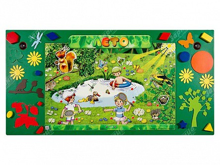 В комплекте со стендом поставляются карточки с изображениями летней атрибутики, что позволяет проводить обучение в игровой форме. Дети выбирают изображение, которое, по их мнению, соответствует элементу на карточке, показанной воспитателем.